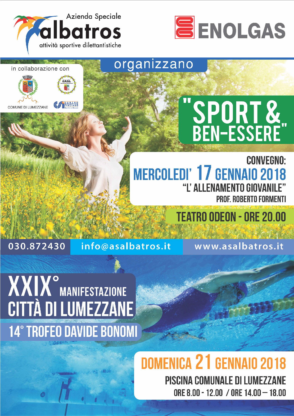 - domenica 21/1/18 presso la piscina Albatros: ore 8 riscaldamento; ore 9 - 12 gare; ore 12,15 premiazioni; ore 14 riscaldamento seconda parte; ore 15 inizio gare, ore 18 termine gare; ore 18,10 inizio finali australiane; ore 18,30 premiazioni.
